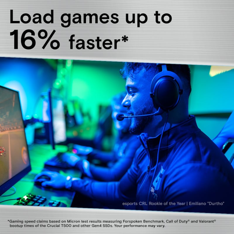 The Crucial T500 PCIe® Gen4 NVMe SSD will improve your gaming and content creation experience. The T500 is a game changer, designed for high-performance gaming, PS5 upgrades, and photo/video editing. With sequential read/write speeds of up to 7,400/7,000MB/s and random read/write speeds of up to 1.44M IOPs, you’ll be able to load games 16% faster…