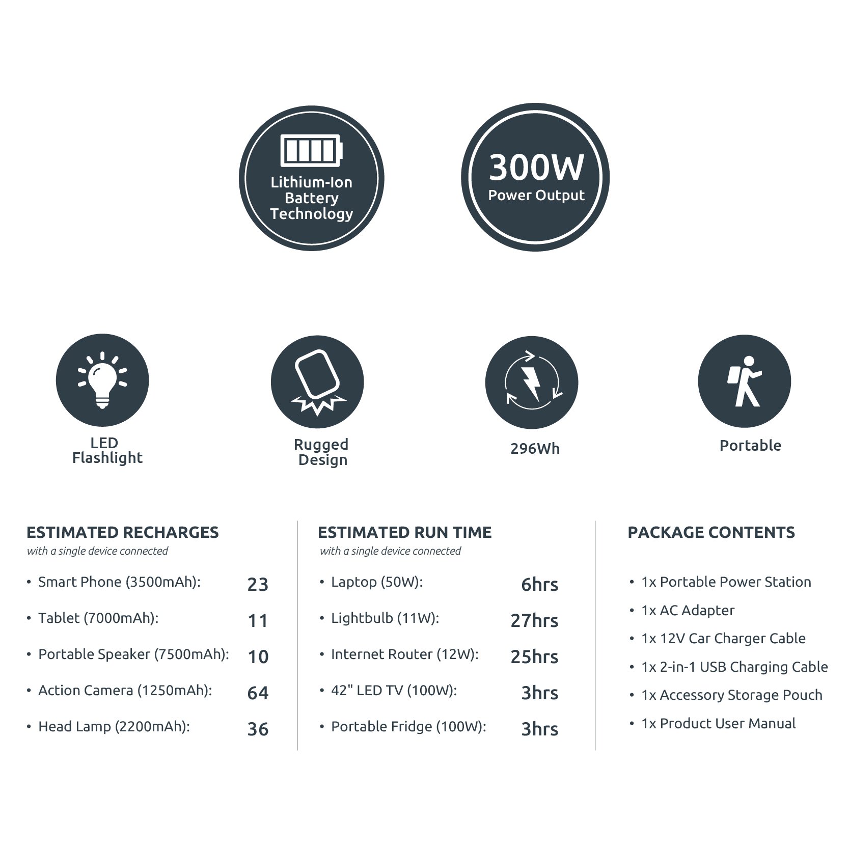The Gizzu 296Wh Portable Power Station is the ideal solution for power outages. It features a 300W power output, 80000mAh lithium-ion battery, 296Wh, an LED flashlight, and a rugged, portable design for powering various small appliances and devices.